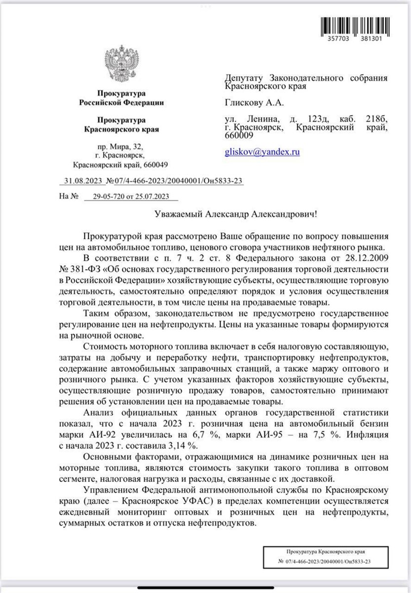 Прокуратура Красноярского края и региональное УФАС не выявили признаков наличия сговора в резком повышении цен на бензин у разных компаний. С просьбой о проведении проверки в отношении участников нефтяного рынка в эти ведомства обратился депутат Заксобрания Александр Глисков . Накануне он опубликовал в своих соцсетях ответы контролирующих органов на его запросы.