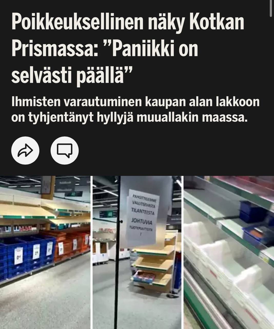 27-летний житель финской Котки говорит, что жители города начали паниковать, услышав о забастовке сотрудников магазинов из-за условий труда. Он отправился за покупками вечером перед первым двухдневным митингом. Полки в хлебном отделе были пустыми, в мясном — похожая ситуация. Макароны тоже быстро исчезли. Мужчина также заметил, что в магазине — непривычно много покупателей для позднего часа, причем с тележками, полными продуктов. Все это напомнило ему первые дни пандемии. Тогда финны скупали туалетную бумагу и рубленые помидоры. Теперь они запасаются хлебом и мясом. Об этом сообщил ТГ-канал «Путин в Telegram».