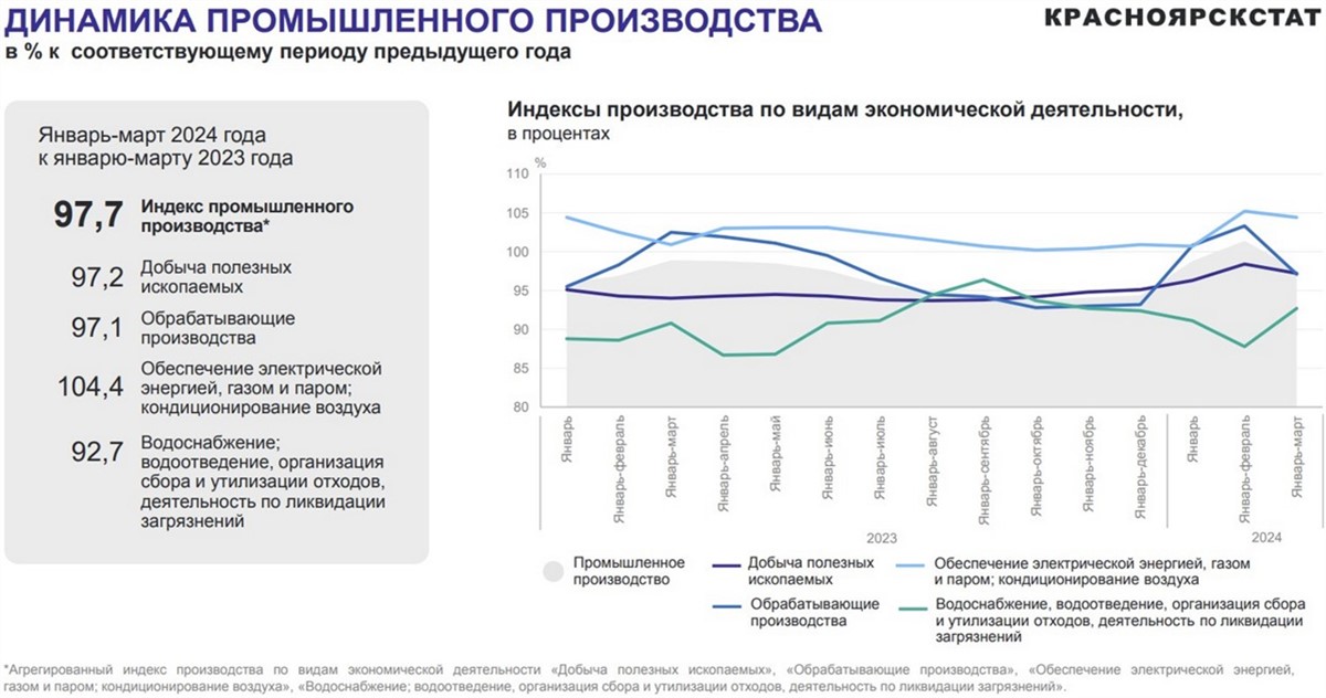 За год — с марта 2023 по март 2024 года — индекс промышленного производства в Красноярском крае сократился на 2,3 %. Cнижение произошло в области обрабатывающих производств (индекс 97,1 %), добывающих производств (97,2 %) и организаций сферы водоснабжения, водоотведения, организации сбора и утилизации отходов, деятельности по ликвидации загрязнений (92,7 % — самое сильное сокращение).