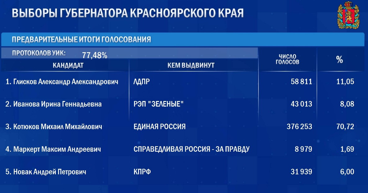 После обработки 77,48 процента бюллетеней лидирует действующий глава региона Михаил Котюков, за него свои голоса отдали 70,72 процента избирателей. За Александра Глискова проголосовали 11,05 процента принявших участие в выборах, за Ирину Иванову — 8,08 процента, за Андрея Новака — 6,0 процента, за Максима Маркерта — 1,69 процента.