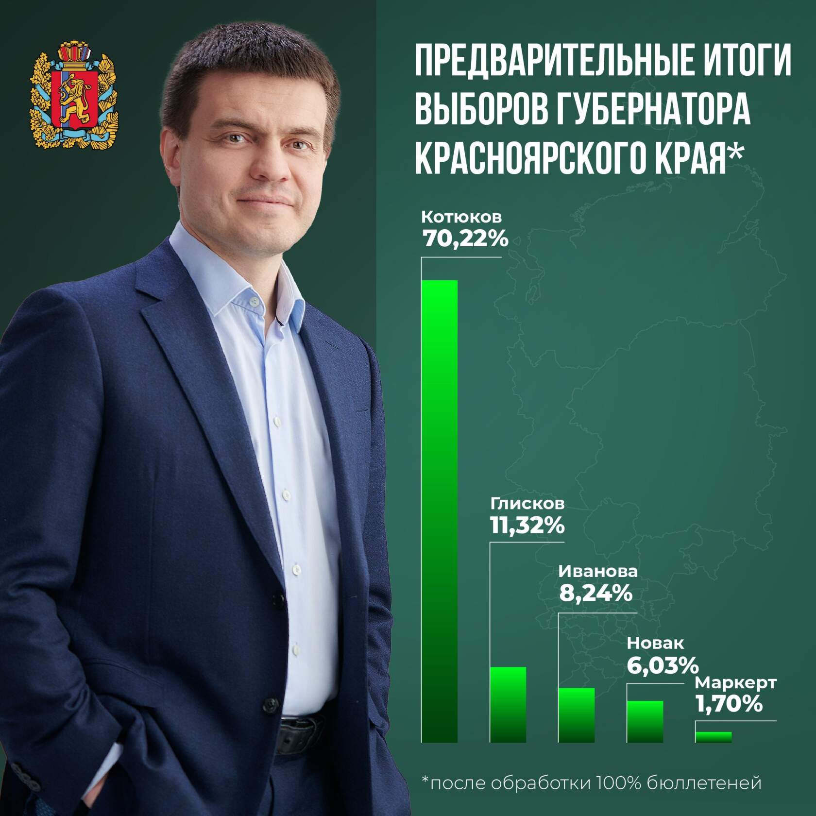 В Красноярском крае обработано 100% бюллетеней. Михаил Котюков набрал 70,22% голосов. Предварительными данными поделился исполняющий обязанности первого заместителя губернатора Сергей Пономаренко.