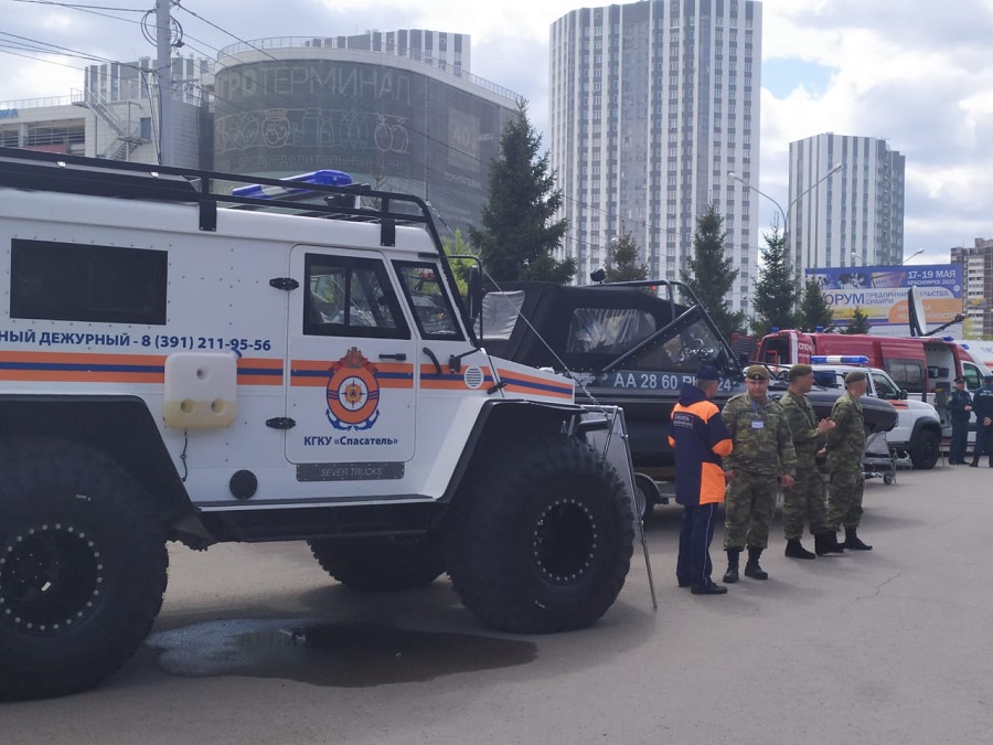 Перед зданием МВДЦ «Сибирь» посетителей встречает выставка пожарно-спасательной техники и оборудования, различные пожарные автомобили (в том числе с медицинским модулем), автомобиль радиационно-химической разведки, гусеничный снегоболотоход и другие спецавтомобили. Также на территории расположена выставка боевой техники.