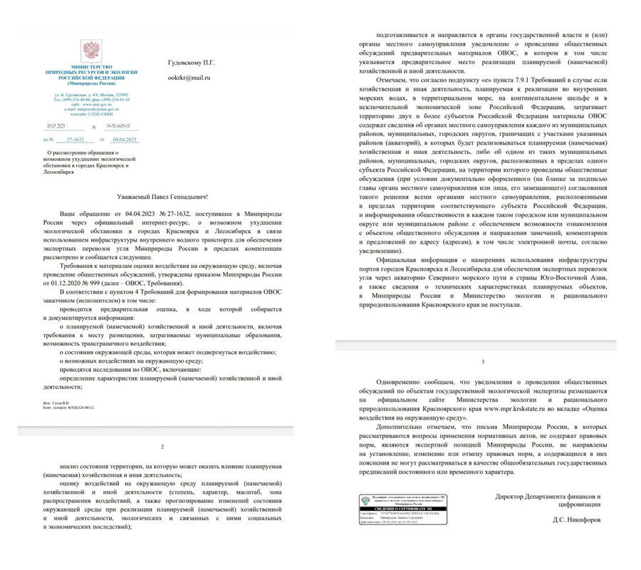 Общественники обратились в Правительство РФ за разъяснениями. Как сообщает в своем телеграмм-канале член Общественной палаты Красноярского края Павел Гудовский , министерство природных ресурсов РФ, понимая всю критичность экологической обстановки в Красноярске и Лесосибирске, считает важным и обязательным согласовать с населением эту угольную инициативу. Также они сообщают, что на данный момент Минприроды РФ и минэкологии края ждут материалы от Минтранса.