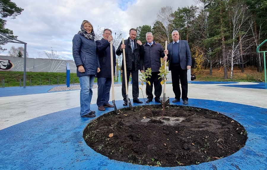 Глава города Дмитрий Чернятин, председатель Совета депутатов Сергей Проскурнин, председатель РПРАЭП Владимир Кузнецов и председатель ТПО Железногорска Александр Перепелкин высадили на берегу озера подарок от профсоюза Зеленогорска – гортензию «Полярный медведь».