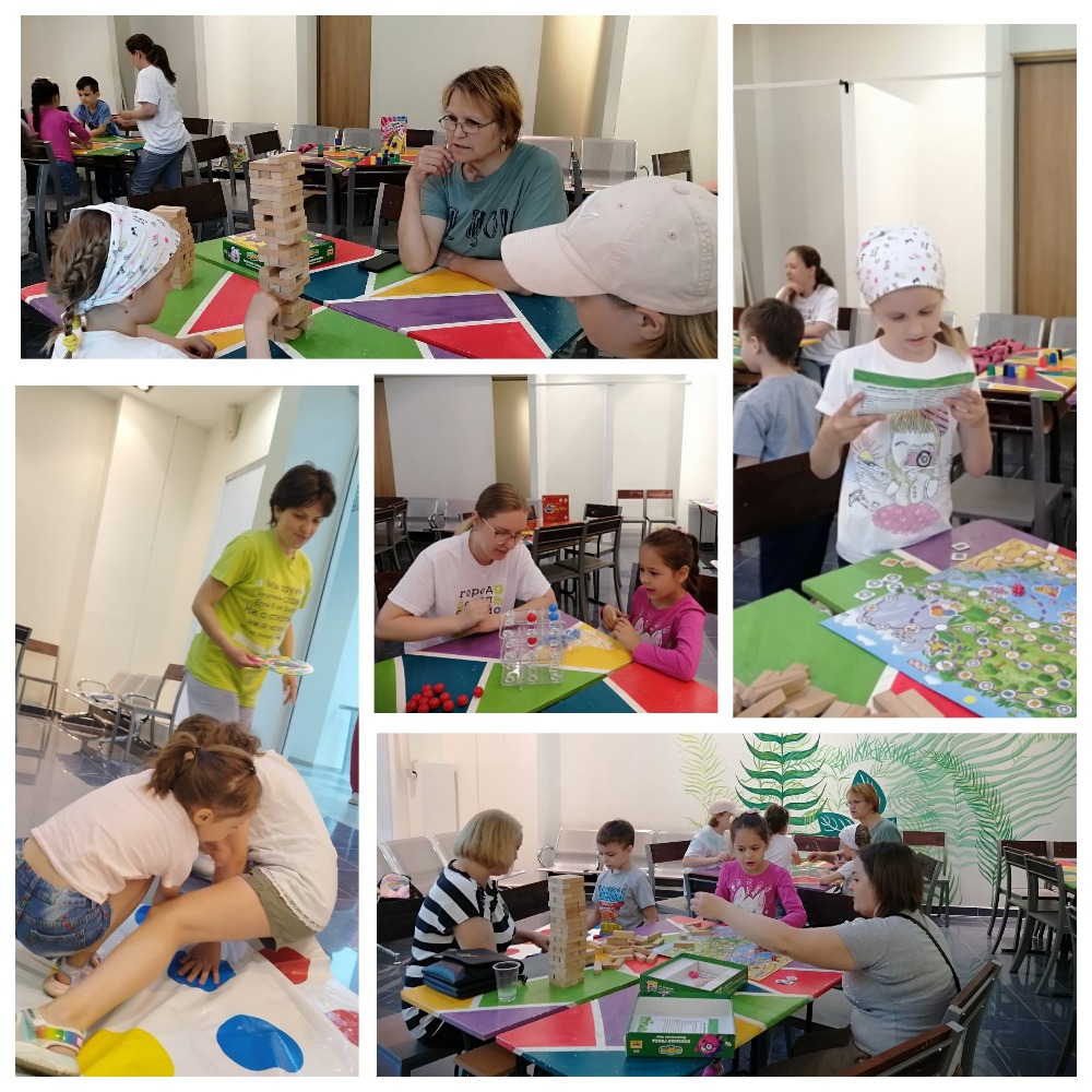 Играли в Дженгу, Крестики - Нолики и лото "Чей хвостик?" и соревновались на гибкость в Твистере.