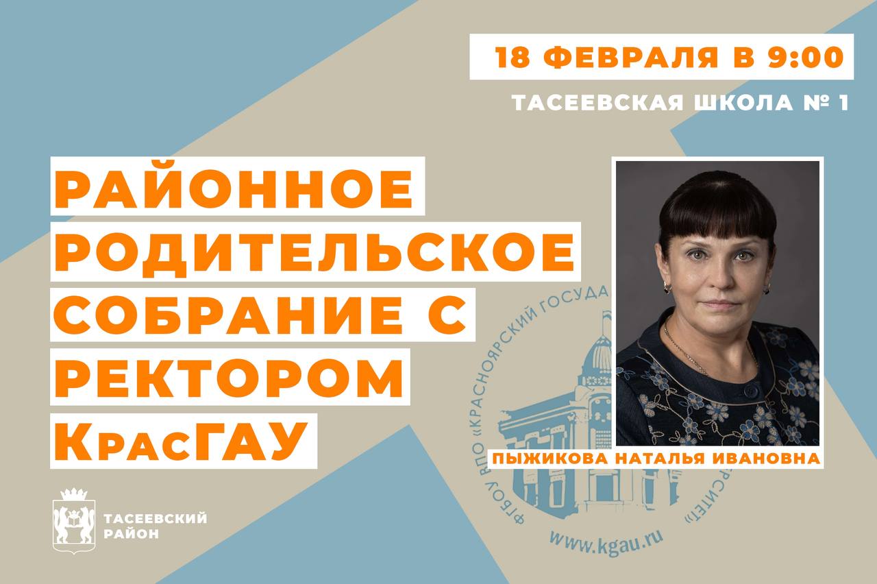 Приглашаем вас на встречу с первым заместителем Министра сельского хозяйства и торговли Красноярского края Александром Николаевичем Походиным, ректором Красноярского государственного аграрного университета, депутатом Законодательного Собрания Красноярского края Натальей Ивановной Пыжиковой, которая состоится 18 февраля 2023 года в 9:00 в актовом зале МБОУ «Тасеевская СОШ № 1» по адресу ул. Краснопартизанская, 24.