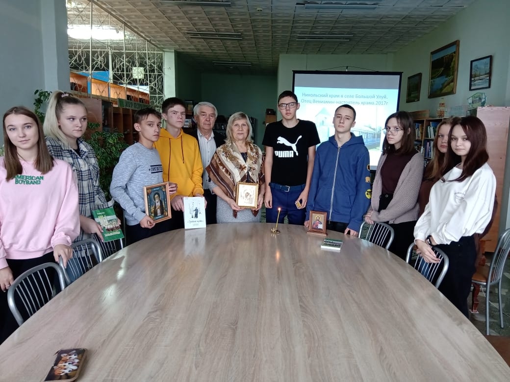 Сегодня в районной библиотеке села Большой Улуй преподаватель воскресной школы Никольского храма Л.В. Ускова провела урок истории для десятиклассников большейлуйской средней школы. В преддверии дня жертв политических репрессий, Людмила Викторовна рассказала ребятам о новомучениках и подвижниках земли большеулуйской, пострадавших от богоборческой власти в прошлом столетии.