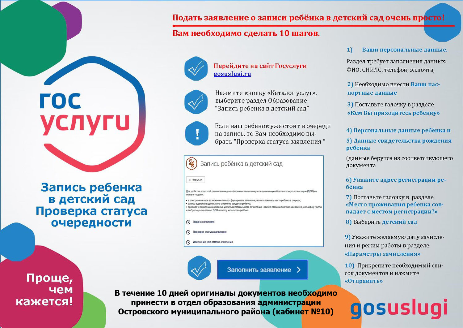 Подать заявление о записи ребенка в детский сад очень просто! Вам необходимо сделать всего 10 шагов (см. фото)