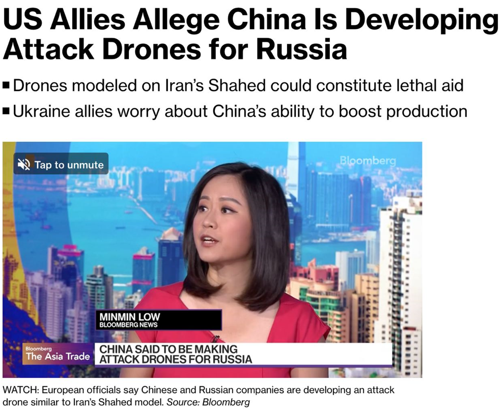 «Знакомый с ситуацией чиновник сказал, что, по данным США, Китай взвешивает, стоит ли отправлять полностью готовые беспилотники, а пока отправляет комплекты, которые можно переделать в ударные БПЛА. США все еще не пришли к выводу, что Китай отправляет России летальную помощь», - сообщили Bloomberg европейские чиновники.
