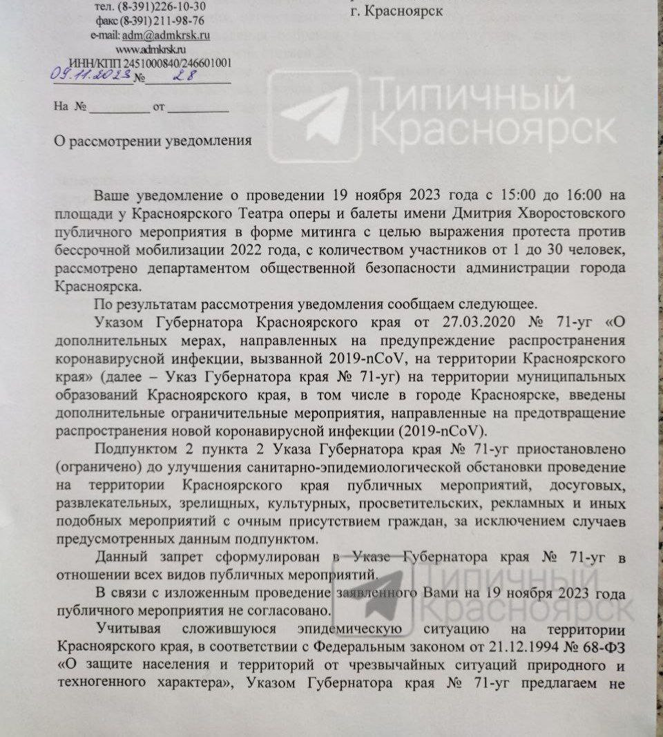 Недовольные такой ситуацией красноярцы хотели 19 ноября собраться на митинг возле Театра оперы и балета. Соответствующее уведомление было направлено в мэрию. Однако замглавы города - руководитель департамента общественной безопасности Михаил Будников запретил мероприятие. Документ был опубликован телеграм-каналом "Типичный Красноярск" .