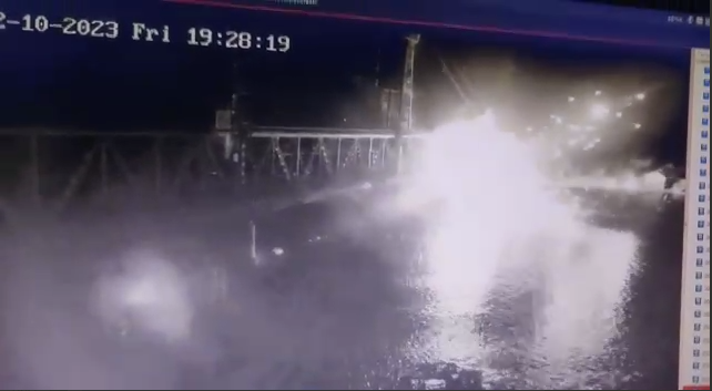Беспилотник быстро двигался по водной поверхности и мощно взорвался точно под низко установленным железнодорожным мостом.