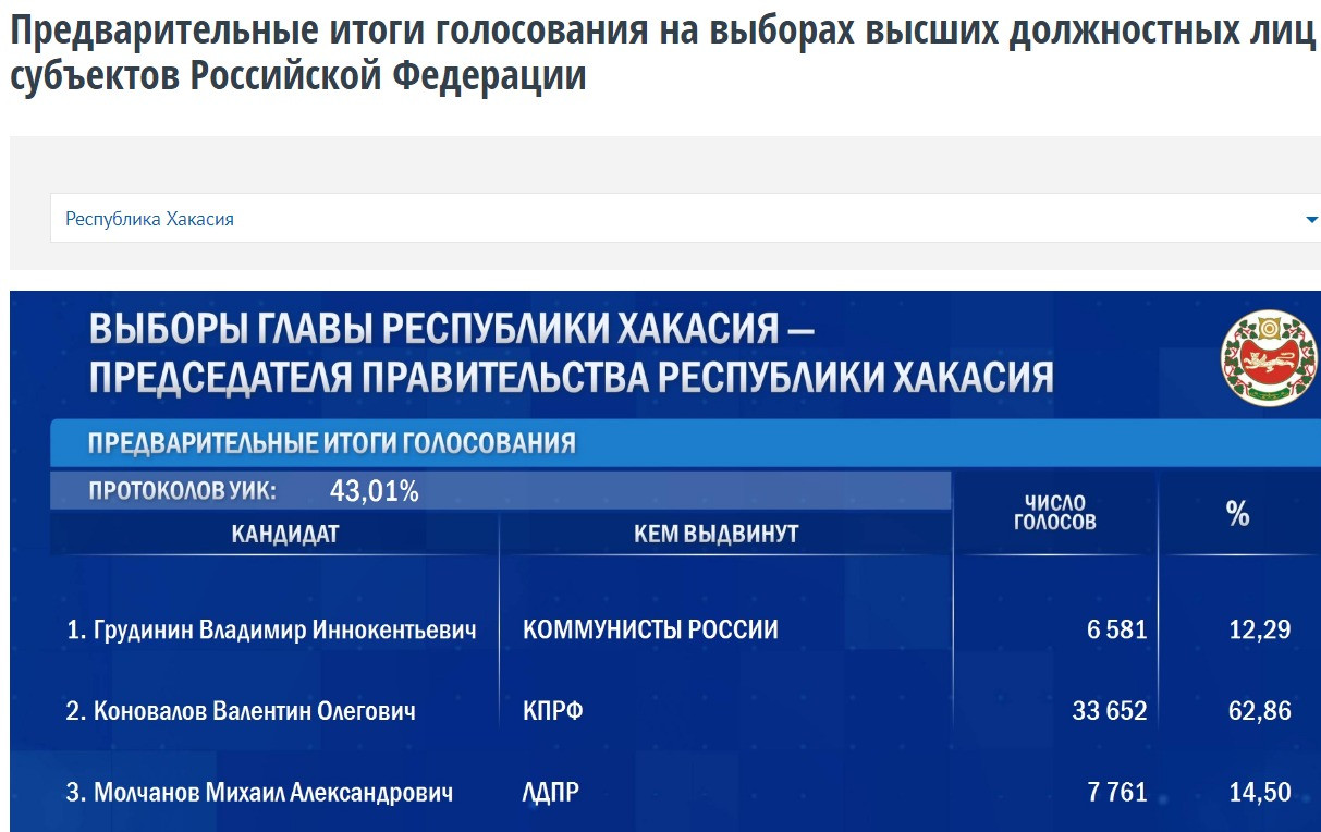 Действующий глава Хакасии Валентин Коновалов лидирует на выборах руководителя региона, свидетельствуют данные Центральной избирательной комисси после обработки 43,01 процента протоколов.