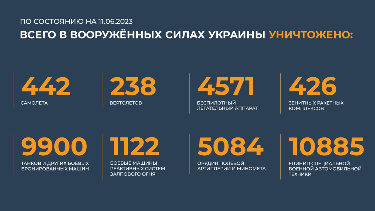 Всего с начала проведения специальной военной операции уничтожено: 442 самолёта, 238 вертолётов, 4 571 беспилотный летательный аппарат, 426 зенитных ракетных комплексов, 9 900 танков и других боевых бронированных машин, 1 122 боевые машины реактивных систем залпового огня, 5 084 орудия полевой артиллерии и миномётов, а также 10 885 единиц специальной военной автомобильной техники.
