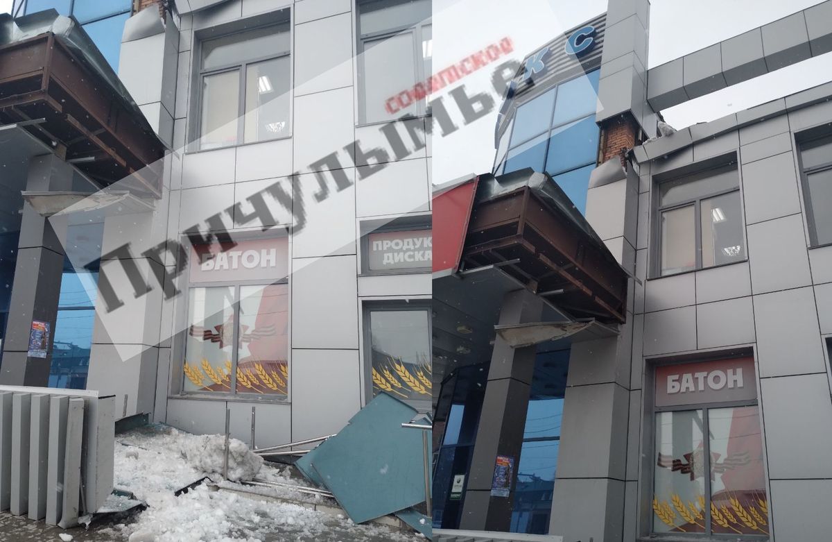 Сотрудники магазина вышли констатировать произошедшее. Снег уберут, фасад починят.