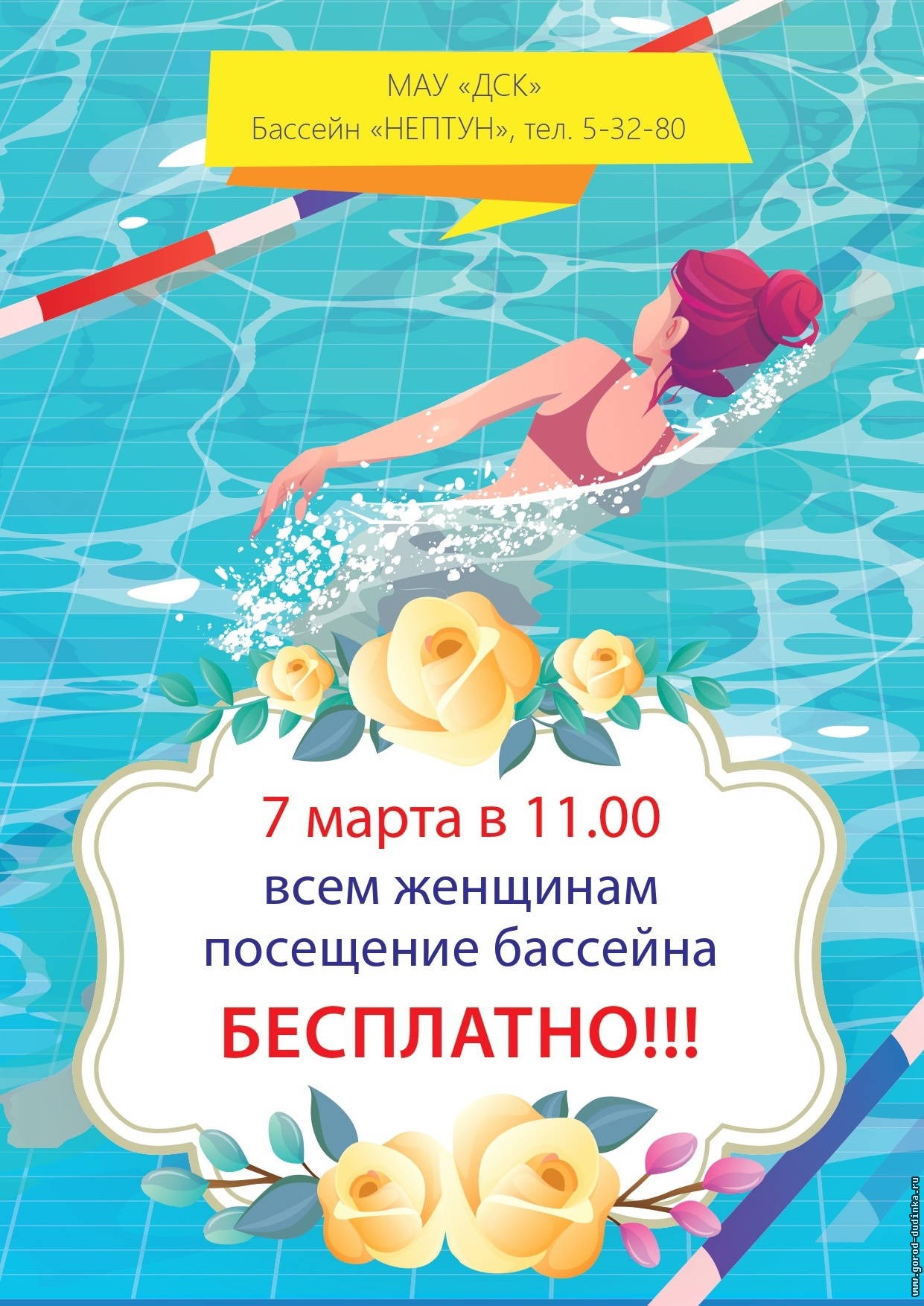 В преддверии Международного женского дня Дудинский спортивный комплекс предлагает жительницам Дудинки воспользоваться предпраздничной акцией плавательного бассейна «Нептун». Так, седьмого марта в 11:00 посещение бассейна для представительниц прекрасного пола будет бесплатным.