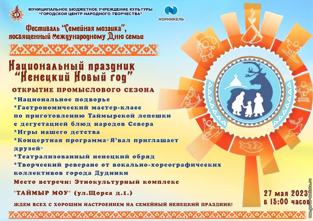 Мероприятие состоится в рамках городского фестиваля «Семейная мозаика». Этнический праздник состоится 27 мая в 15:00 на территории этнокультурного комплекса «Таймыр МОУ» (ул.