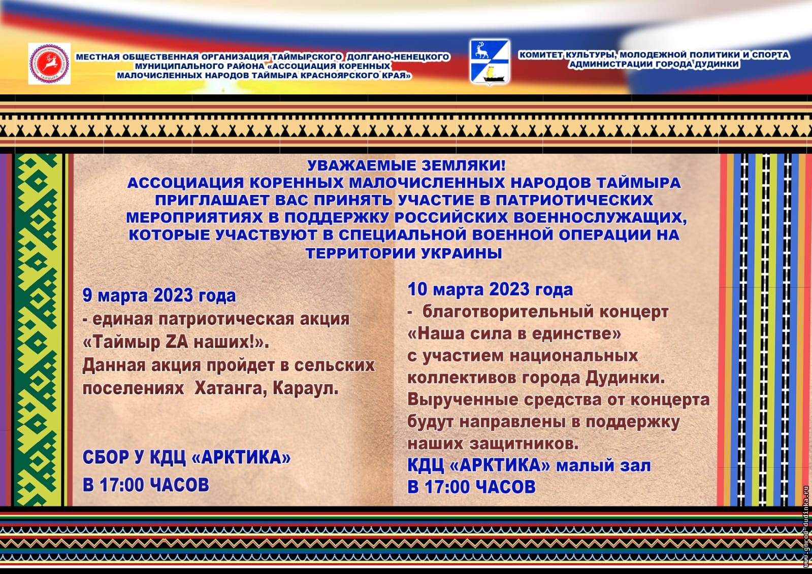 Девятого и десятого марта в городе Дудинке и сельских поселениях Хатанга и Караул пройдут патриотические мероприятия в поддержку российских военнослужащих, участвующих в специальной военной операции.
