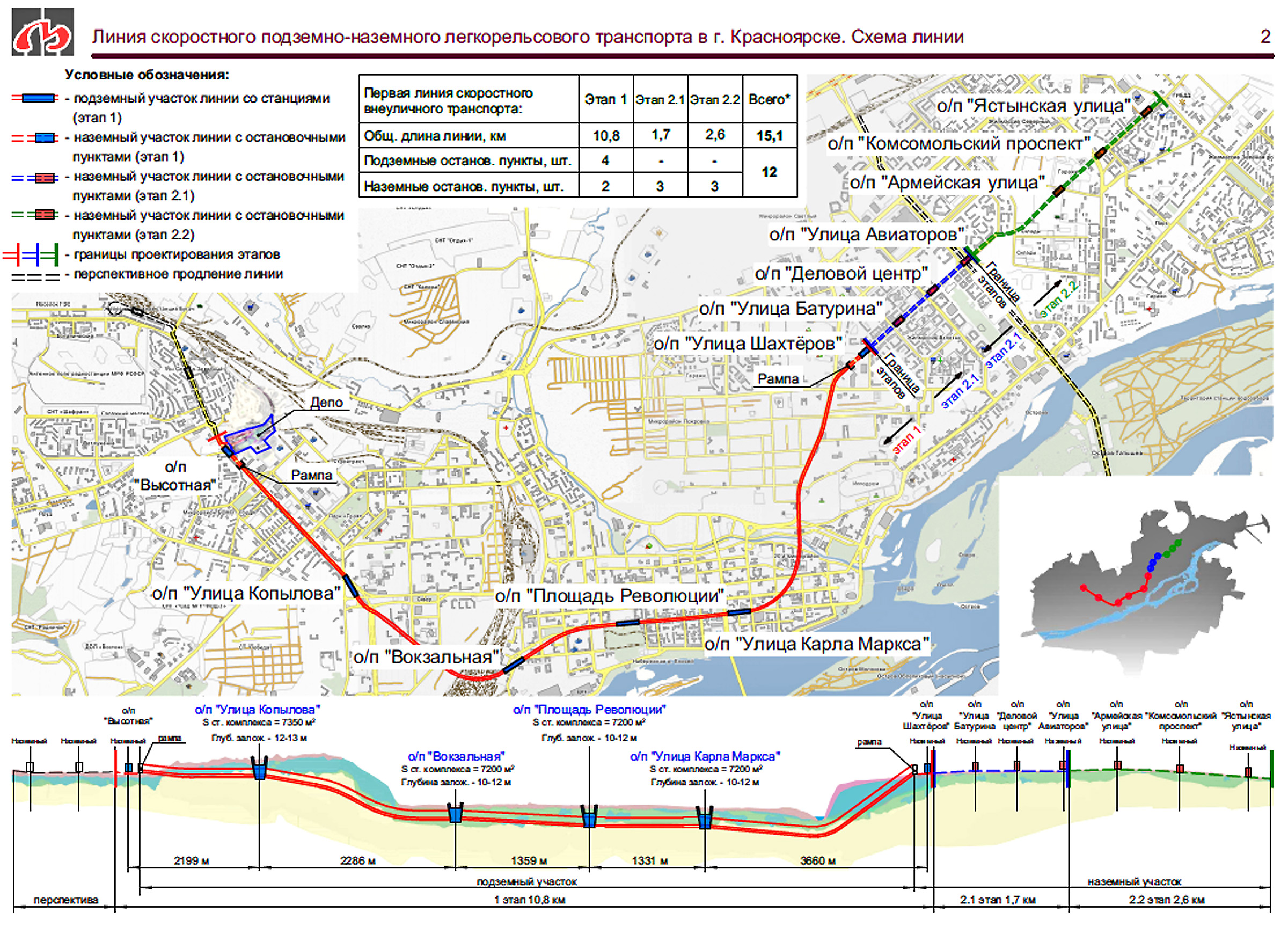Первые два этапа строительства скоростного подземно-наземного рельсового транспорта реализуются в пределах Красноярска, затем метро протянется и в Емельяновский район