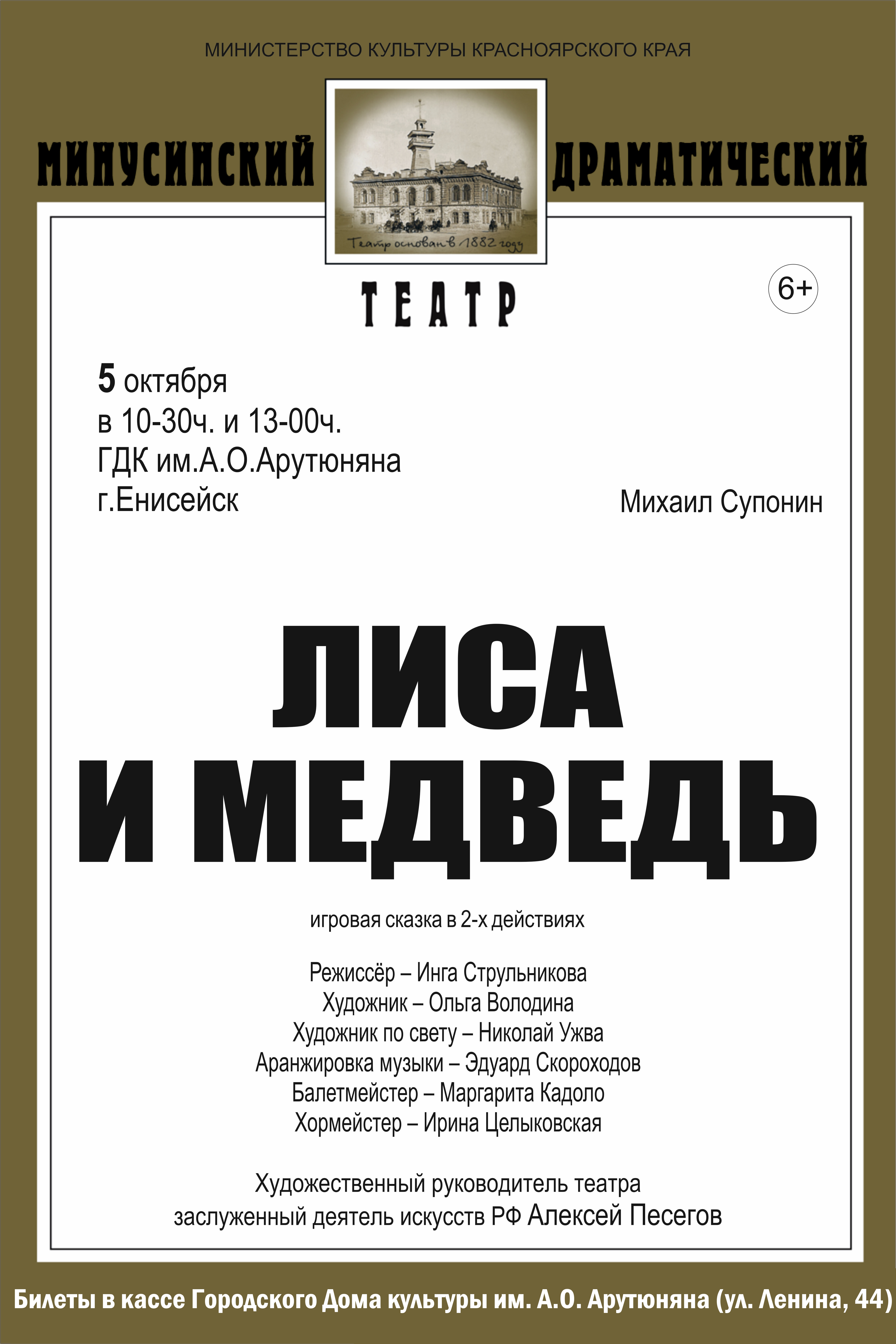 МИНУСИНСКИЙ ДРАМАТИЧЕСКИЙ ТЕАТР на сцене Городского Дома культуры с игровой сказкой в 2-х действиях "ЛИСА И МЕДВЕДЬ"