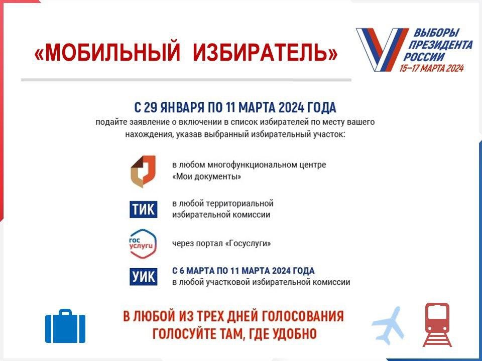 Механизм «Мобильный избиратель» даёт возможность избирателям проголосовать на выборах Президента России в любой точке нашей страны вне зависимости от места регистрации. Для этого нужно подать заявление о включении в список избирателей по месту нахождения в срок с 29 января по 11 марта.