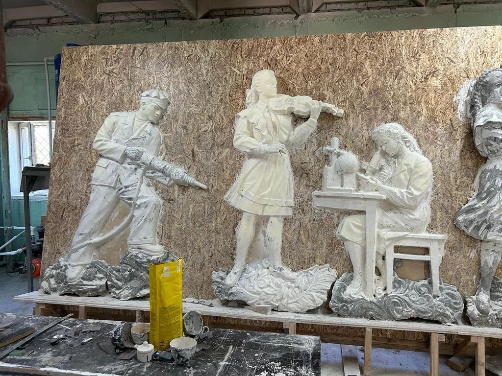 Восстановлением барельефа занимается мастерская скульптора Евгения Замураева. Специалисты по крупицам воссоздают изображения гипсовых ребятишек и предметов.