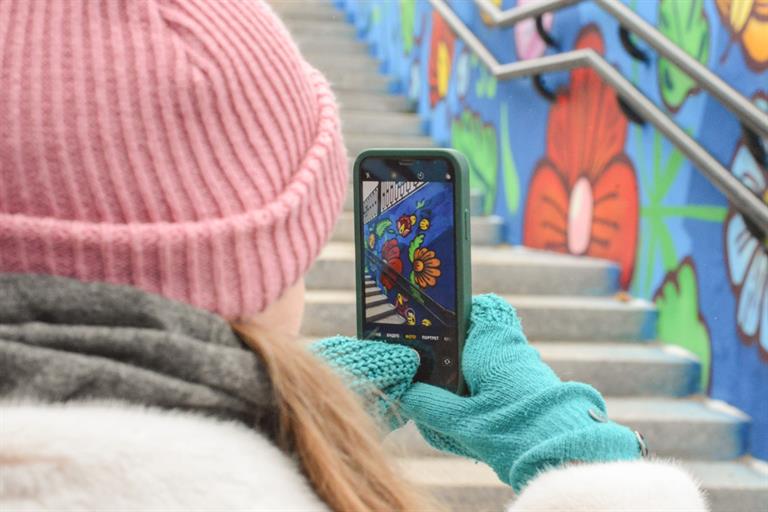 Лестницу, ведущую на енисейский берег, расписал яркими цветами Никита Гердт. Площадь граффити составляет двести квадратных метров.