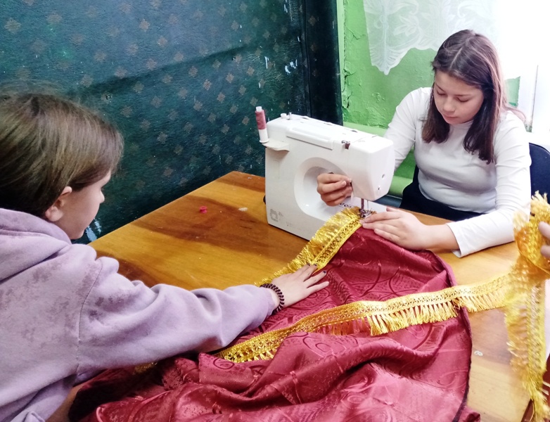 Своими руками девочки изготовили, сшили особый полог, который вешался перед кроватью, многослойную войлочную подстилку на кровать, скатерти, шторки для украшения мебельных секций юрты. Все эти элементы интерьера выполнены согласно описаниям Бутанаевых. В настоящее время девочки расшивают важнейший элемент женского костюма- пого.