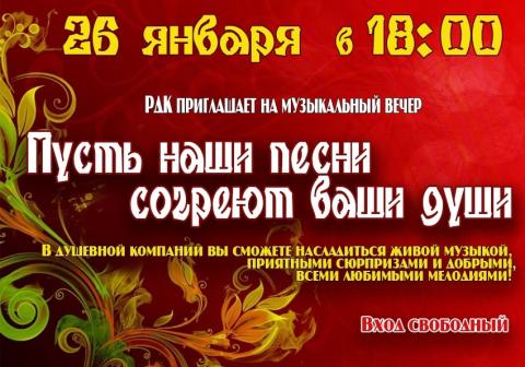 Мероприятие «Пусть наши песни согреют ваши души» состоится 26 января в 18.00.