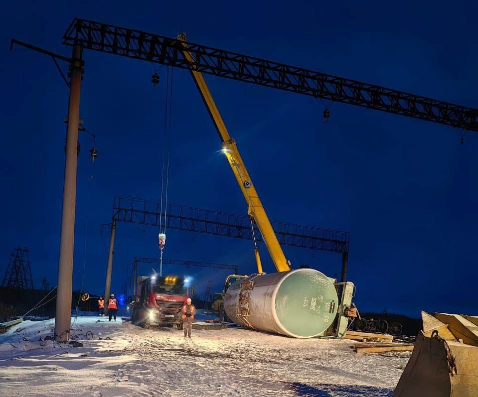 По предварительным данным, около 23.00 23 октября на станции Дудинка-Сортировочная при следовании грузового состава с рельсов сошли три вагона с цистернами, один из которых при этом опрокинулся.