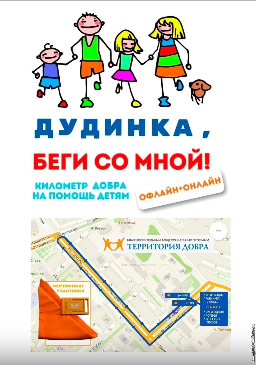 22 июля в Дудинке впервые пройдет благотворительный забег «Дудинка, беги со мной!». Акцию организует благотворительный фонд «Социальных программ «Территория добра». Собранные средства будут направлены на лечение и реабилитацию нуждающимся в помощи детям из Дудинки.