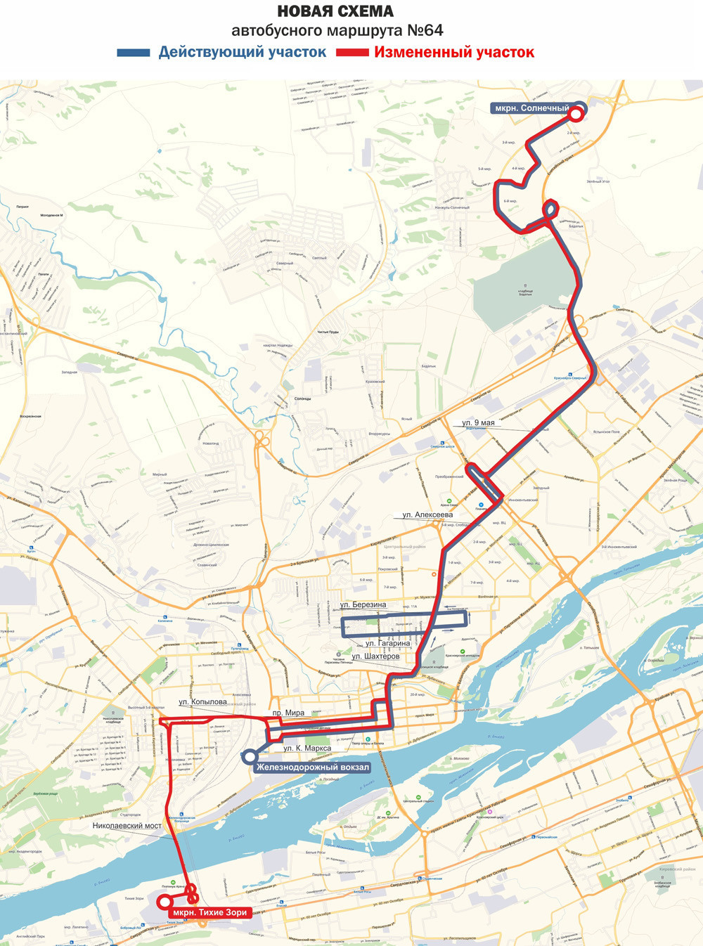 Маршрут №64 продлили до микрорайона Тихие Зори. Транспорт теперь проезжает через Николаевский мост. Также меняется схема движения в Центральном районе. Автобус не сворачивает на Березина, Спандаряна и Гагарина, а едет по Шахтёров.