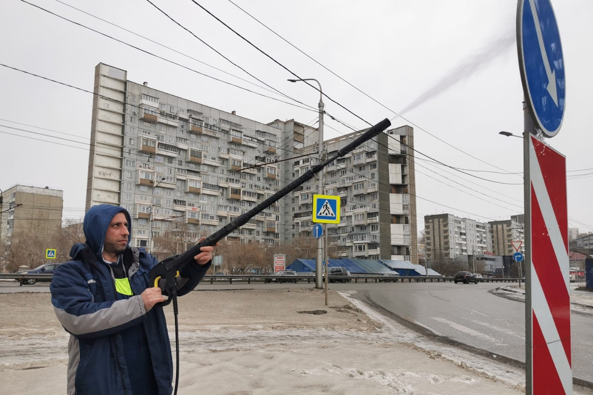 В Красноярске коммунальные бригады приступили к мытью дорожных знаков.
