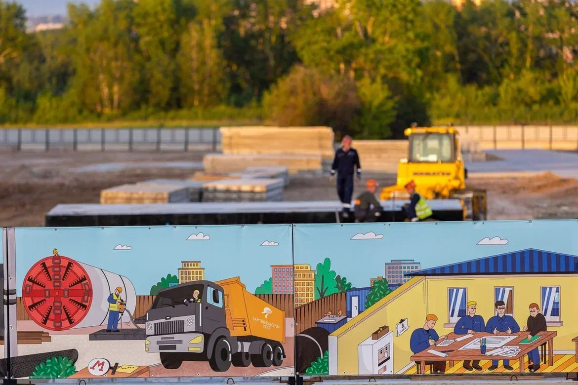 Реализация проекта красноярского метро идёт ударными темпами. Сегодня строители сообщили, что начали украшать забор городка вахтовиков баннерами.