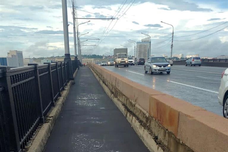 Пешеходный тротуар над основным руслом реки Енисей давно нуждался в ремонте. Асфальтовое покрытие сильно изношено. Чтобы обойти скопившиеся лужи, красноярцам приходилось забираться на разделительные ограждения, рискуя угодить под колеса машин.
