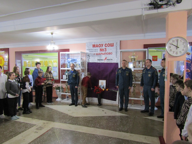 3 февраля в годовщину трагической гибели нашего земляка награжденного «Орденом Мужества» (посмертно) пожарного 3-й пожарно-спасательной части 1 ПСО по охране г. Красноярск сержанта внутренней службы Максима Рябцева в школе № 3 города Шарыпово, где он учился, состоялось памятное мероприятие.