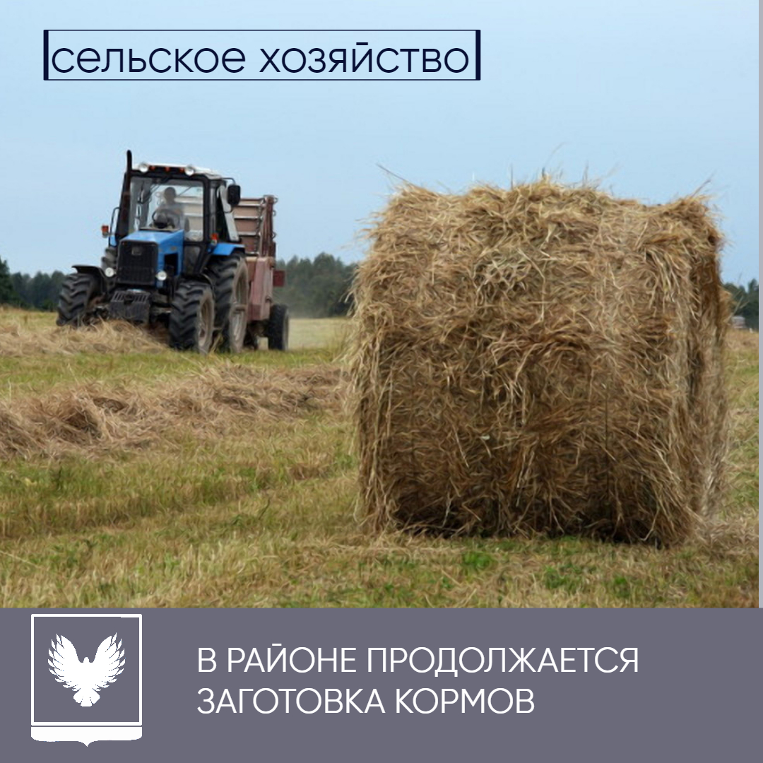 В хозяйствах района заготавливают сено и сенаж. По состоянию на 25 июля в хозяйствах района скошено 1741 га многолетних и естественных трав, заготовлено 2159 тонн сена или 44,6% от планируемого объема заготовки и 4615 тонн сенажа или 56,6 % от плана, заготовлено 9,9 ц.к.ед на одну условную голову или 43,5% от планируемых 22,7 ц.к.ед.