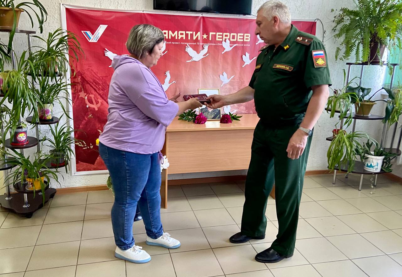 Сегодня, 7 июля Глава Иланского района Ольга Альхименко и военный комиссар Александр Морозов вручили Алексеевич Ирине Анатольевне, матери погибшего участника СВО Алексеевича Евгения Викторовича, медаль «За отвагу» посмертно.