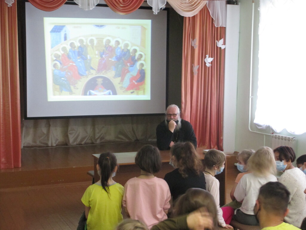 Отец Александр рассказал ребятам о православных праздниках Рождества Пресвятой Богородицы и о Вознесении Животворящего Креста Господня и показал детям видеоролик, а также ответил на возникшие вопросы.