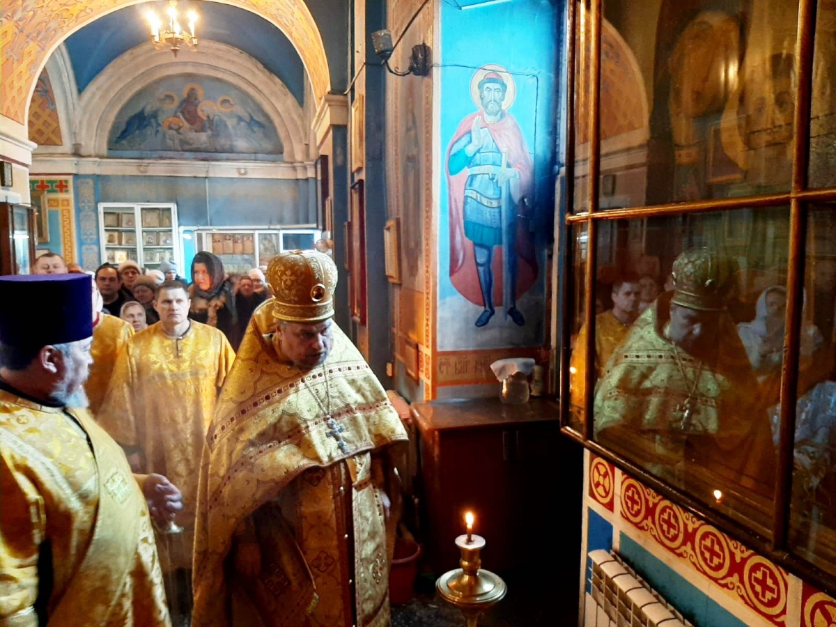 Эта расстрелянная икона-«мученица» вынесена из Георгиевского Алтаря собора для всеобщего поклонения накануне Дня памяти новомучеников и исповедников Церкви Русской. В своей проповеди отец Евгений вспомнил то время, когда богоборцы расстреливали священников и простых верующих, и даже иконы, тем самым как бы стреляя в Самого Бога, Которого отвергли.