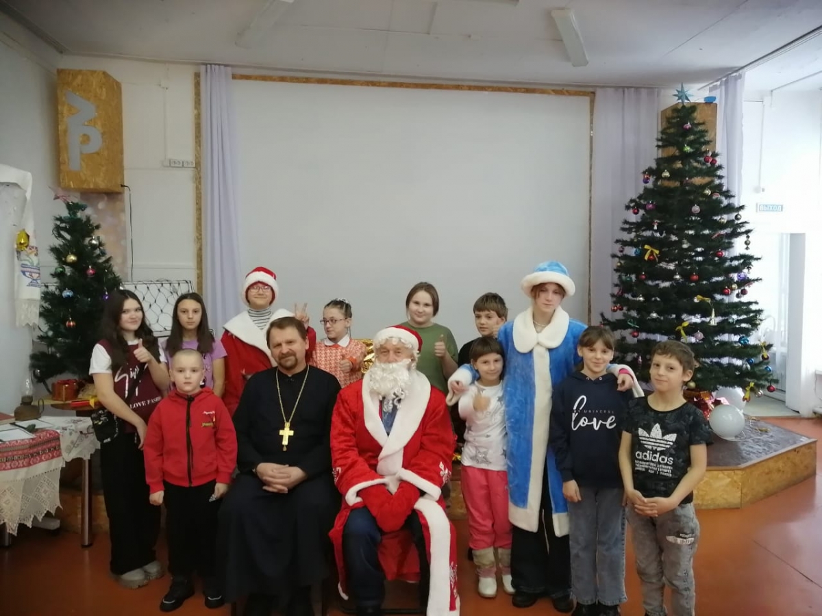 Протоиерей Александр рассказал ребятам о приближающемся празднике Рождества Христова, Дед Мороз и Снегурочка прочитали стихи и угостили ребят чаем со сладостями.