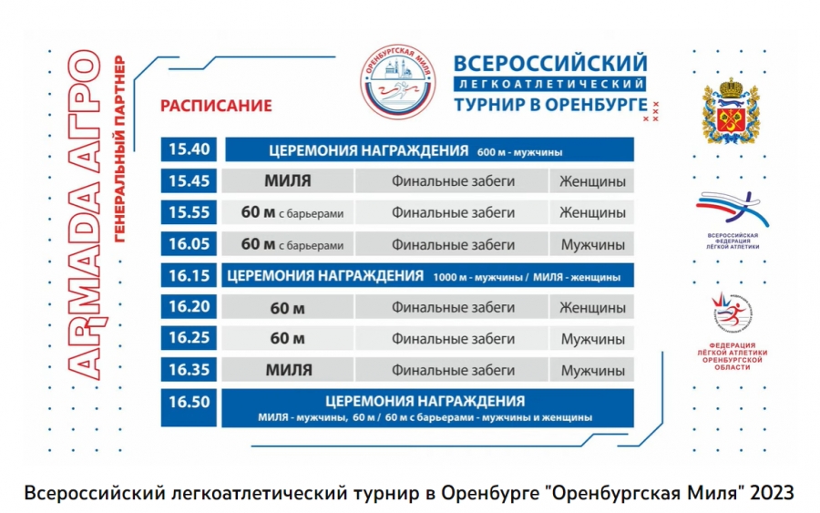 Игорь Образцов , Анастасия Романова , Ярослав Ткалич , Наталья Комбарова (все – 60м.); Ирина Болдырева , Константин и Филипп Шабановы , Анатолий Киселев (все – 60м. с/б); Екатерина Реньжина (600м.), Константин Толоконников , Игорь Ращупкин (оба – 1000м.) Владимир Никитин , Светлана Аплачкина , Евгений Кунц , Ольга Вовк (все – 1 миля); и это далеко неполный состав соискателей чемпионата, первенства и «Оренбургской мили»-2023…