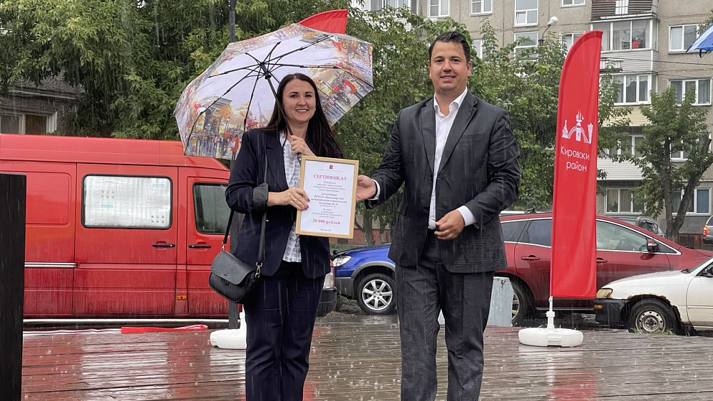 За призовое место в районном этапе городского конкурса КГБУЗ «КМКБ №4» вручили ценный приз. Денежный сертификат на 20 тысяч рублей из рук первого заместителя руководителя Кировского района Александра Клименко получила руководитель административно-хозяйственной службы Ольга Копытина. Выигранные в конкурсе средства планируется использовать на дальнейшее преображение территории больницы.