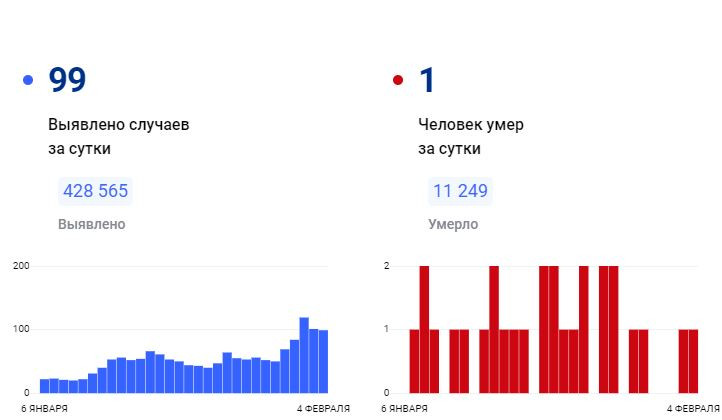 За всё время зафиксировано 428 565 подтверждённых диагнозов (+99 за сутки) 416 429 человек выздоровели (+56 за сутки) 11 249 погибших (+1 за сутки) 32 человека госпитализировано за суткиПоследние новости