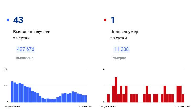 За всё время зафиксировано 427 676 подтверждённых диагнозов (+43 за сутки) 415 710 человек выздоровели (+49 за сутки) 11 238 погибших (+1 за сутки) 5 человек госпитализировано за суткиПоследние новости