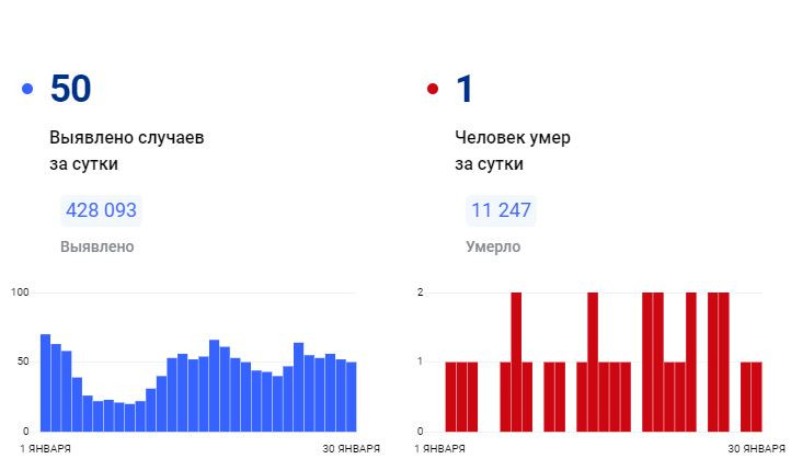 За всё время зафиксировано 428 093 подтверждённых диагноза (+50 за сутки) 416 072 человека выздоровели (+59 за сутки) 11 247 погибших (+1 за сутки) 6 человек госпитализировано за суткиПоследние новости