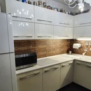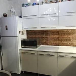 Кухня: на полу керамогранит с подогревом, потолок натяжной, кухонный гарнитур остается со встроенной техникой.