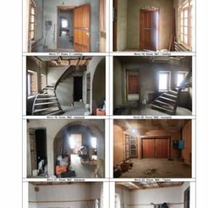 (б) 1 этаж: прихожая, комната, гостиная (с камином), кухня (с выходом на задний двор), сан.узлы, выход в гараж, на -1 этаж и 2 этаж;